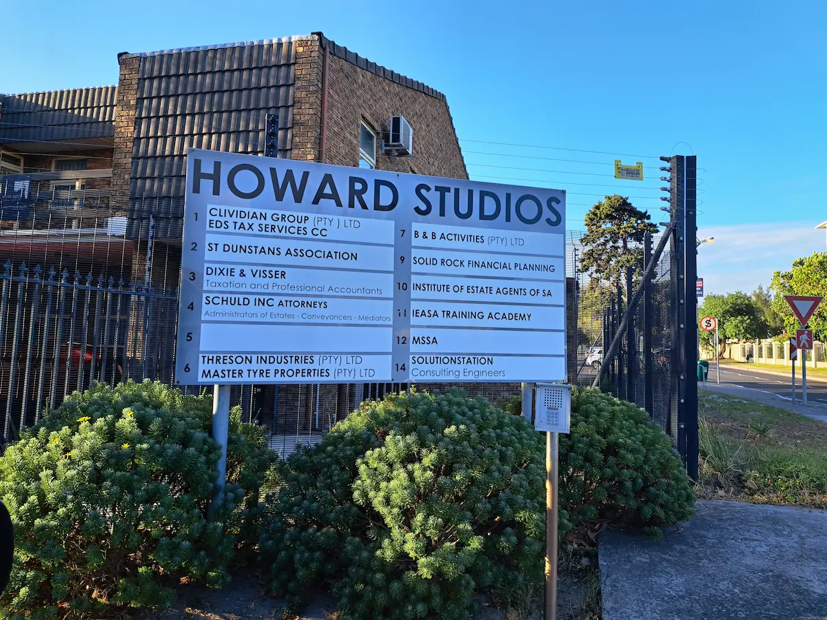 - Physical address at Unit 4, Howard Studios, 1 Sheldon Way (a small business park). Also based in Howard Studios, interestingly enough, is the Institute of Estate Agents of South Africa.